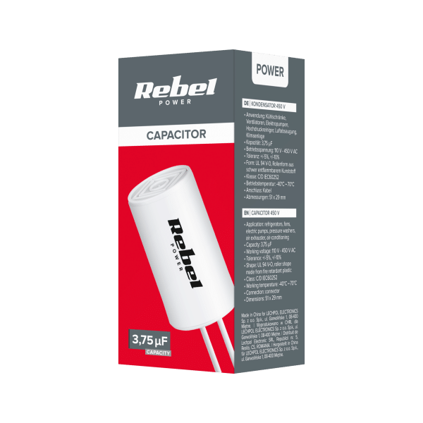 Ovaj kondenzator od 3,75 uF sa radnim naponom do 450V je pouzdana komponenta dizajnirana za jednofazne motore, koji se široko koristi u uređajima kao što su frižideri, ventilatori, električne pumpe, perači pod pritiskom, ventilatori i sistemi za klimatizaciju.